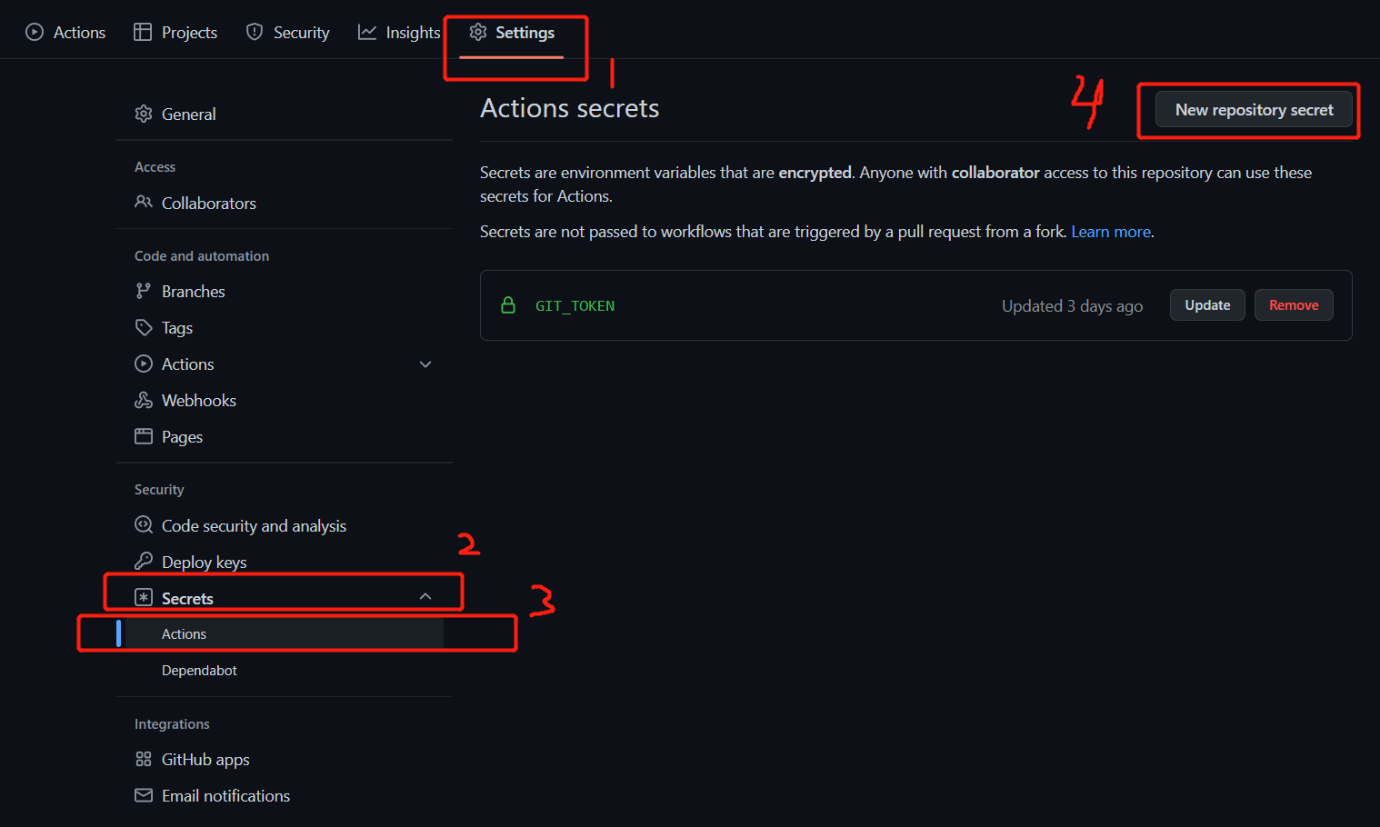 进入_post的仓库,选择settings,然后选择 Security-Actions-New repository secret